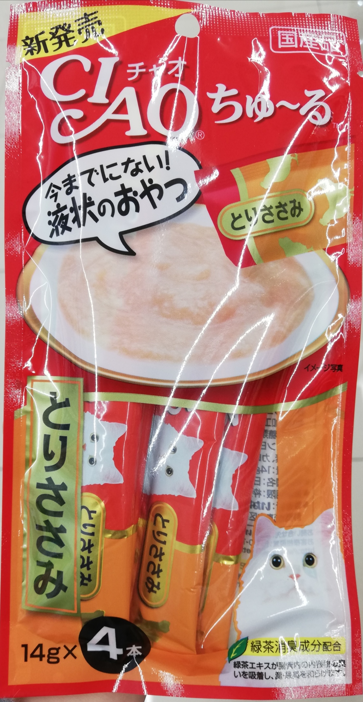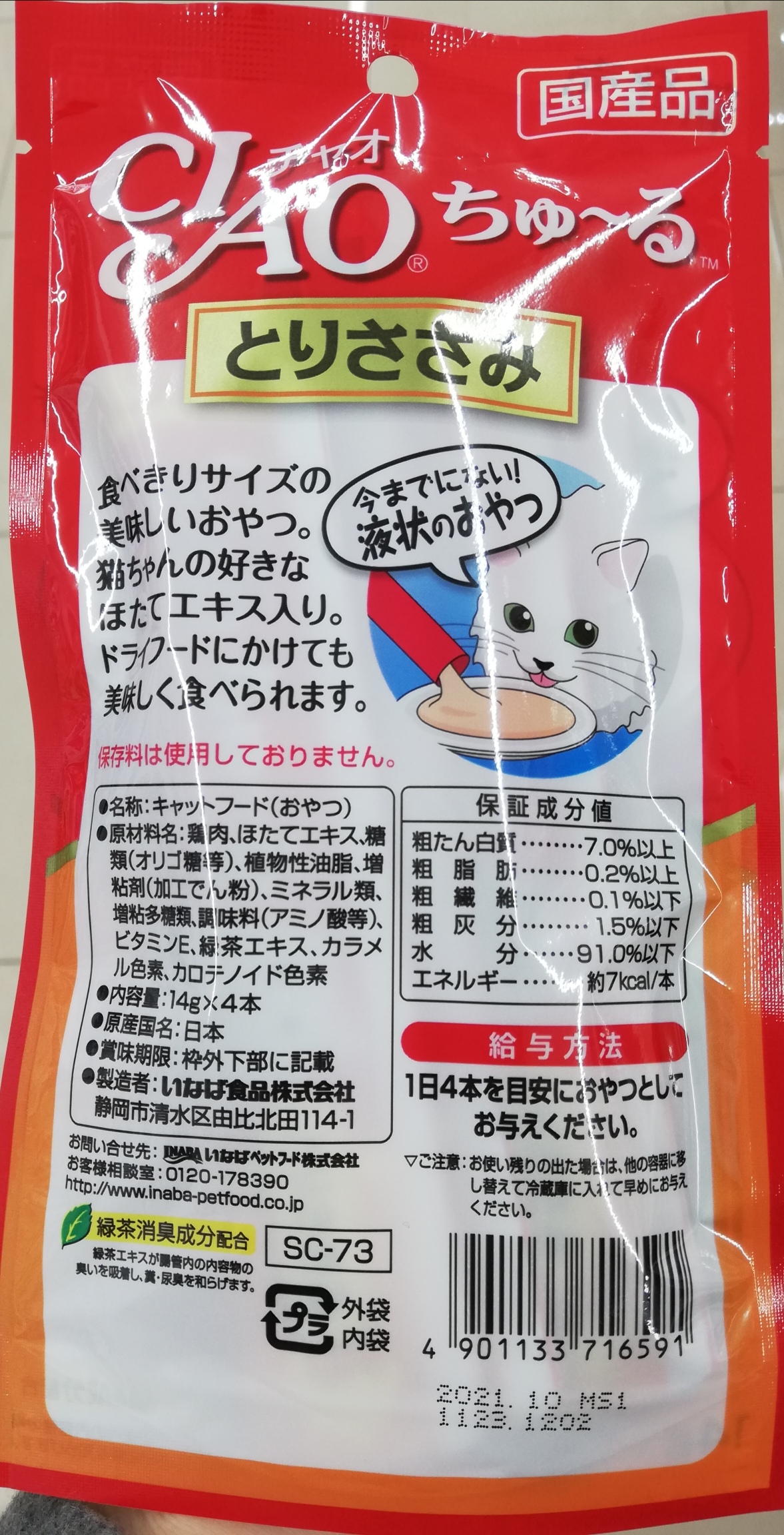 ・成份為:雞、扇貝提取物,糖(低聚醣等)、植物油脂、增稠劑(加工澱粉)、礦物質、增稠多醣、調味料(氨基酸等)、維生素E、綠茶提取物、焦糖色素、類胡蘿蔔素色素