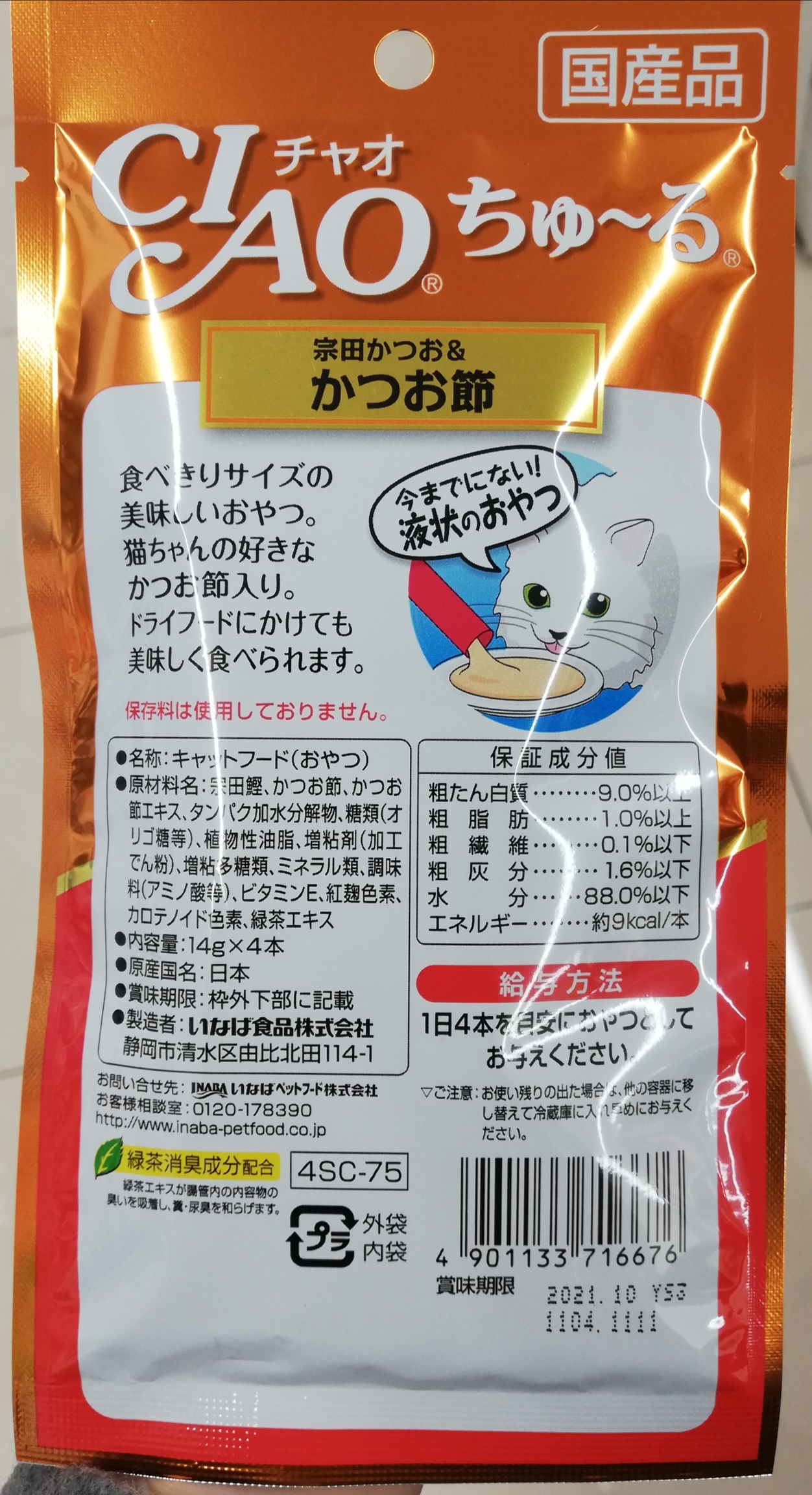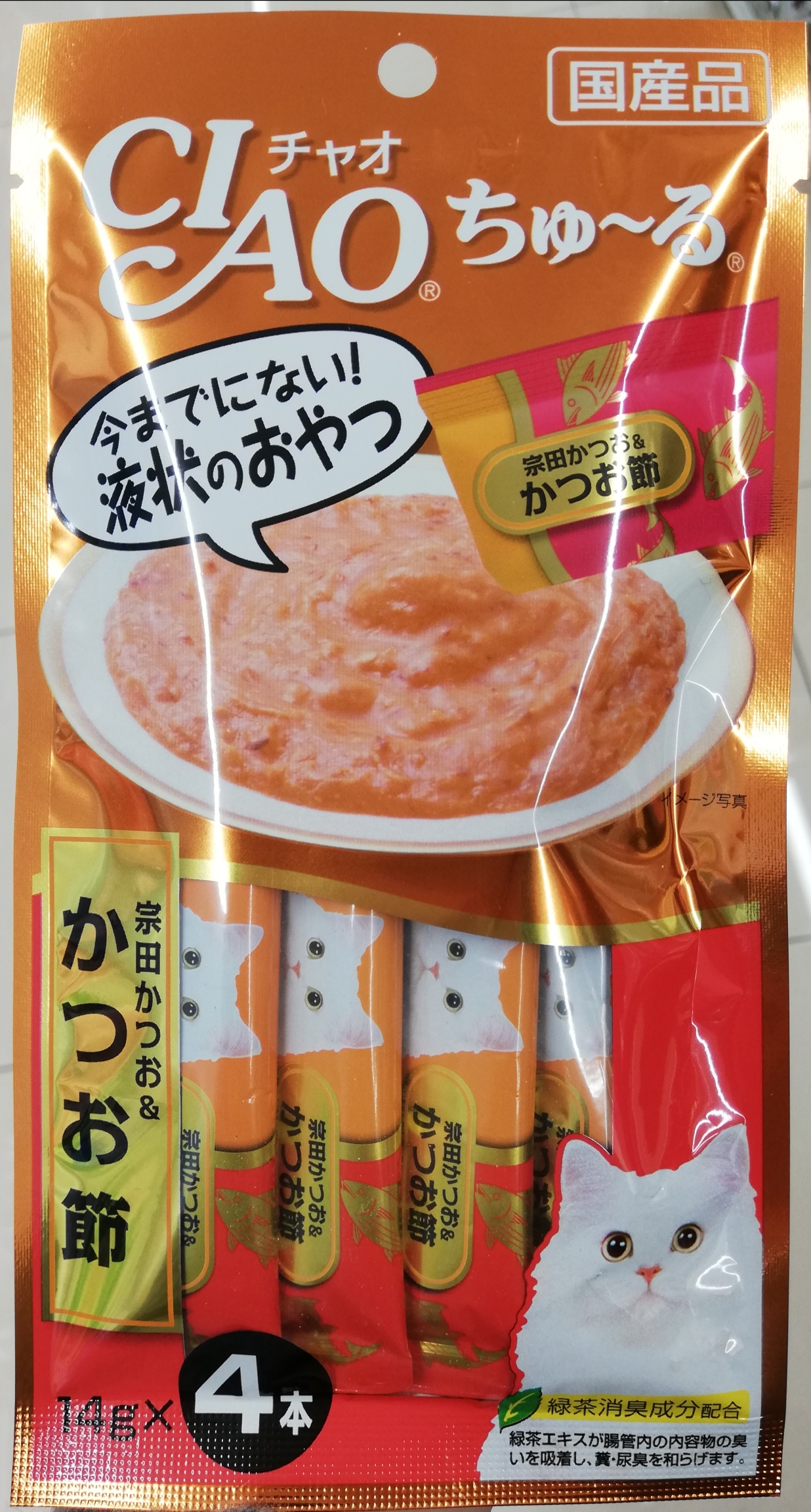 ・成份為:宗田鰹魚、鰹魚片、魚提取物、蛋白質水解物、糖(低聚醣等)、植物油、增稠劑(加工澱粉)、增稠多醣、礦物質、調味料(氨基酸等)、維生素E、紅曲染料、類胡蘿蔔素染料、綠茶提取物